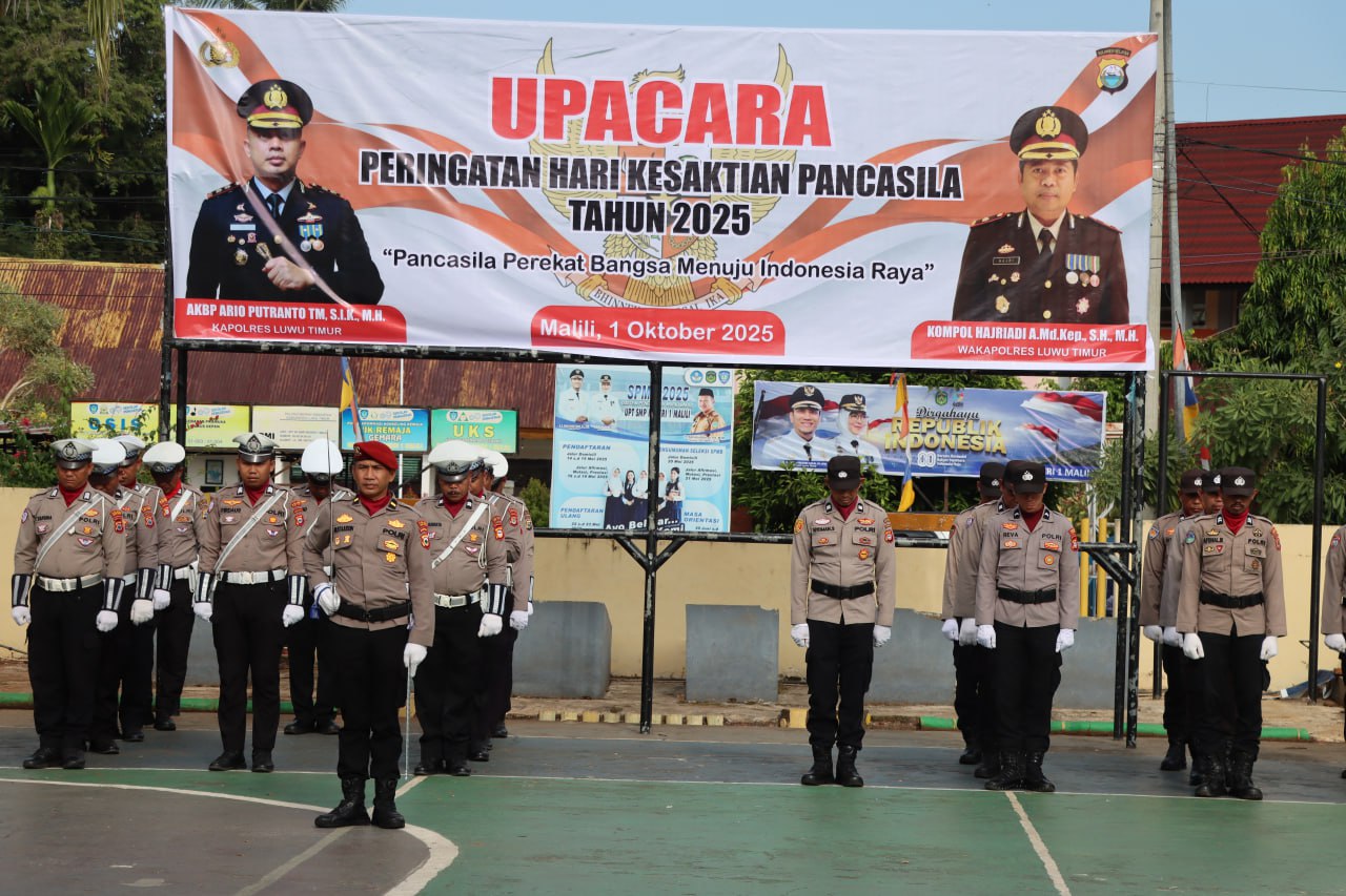 RadarLuwu, Luwu Timur – Jajaran Polres Luwu Timur melaksanakan Upacara Peringatan Hari Kesaktian Pancasila di lapangan apel Mapolres Luwu Timur, Rabu (1/10/2025). Upacara berlangsung dengan khidmat sebagai bentuk penghormatan dan penghayatan terhadap nilai-nilai Pancasila sebagai dasar negara dan pedoman hidup berbangsa.