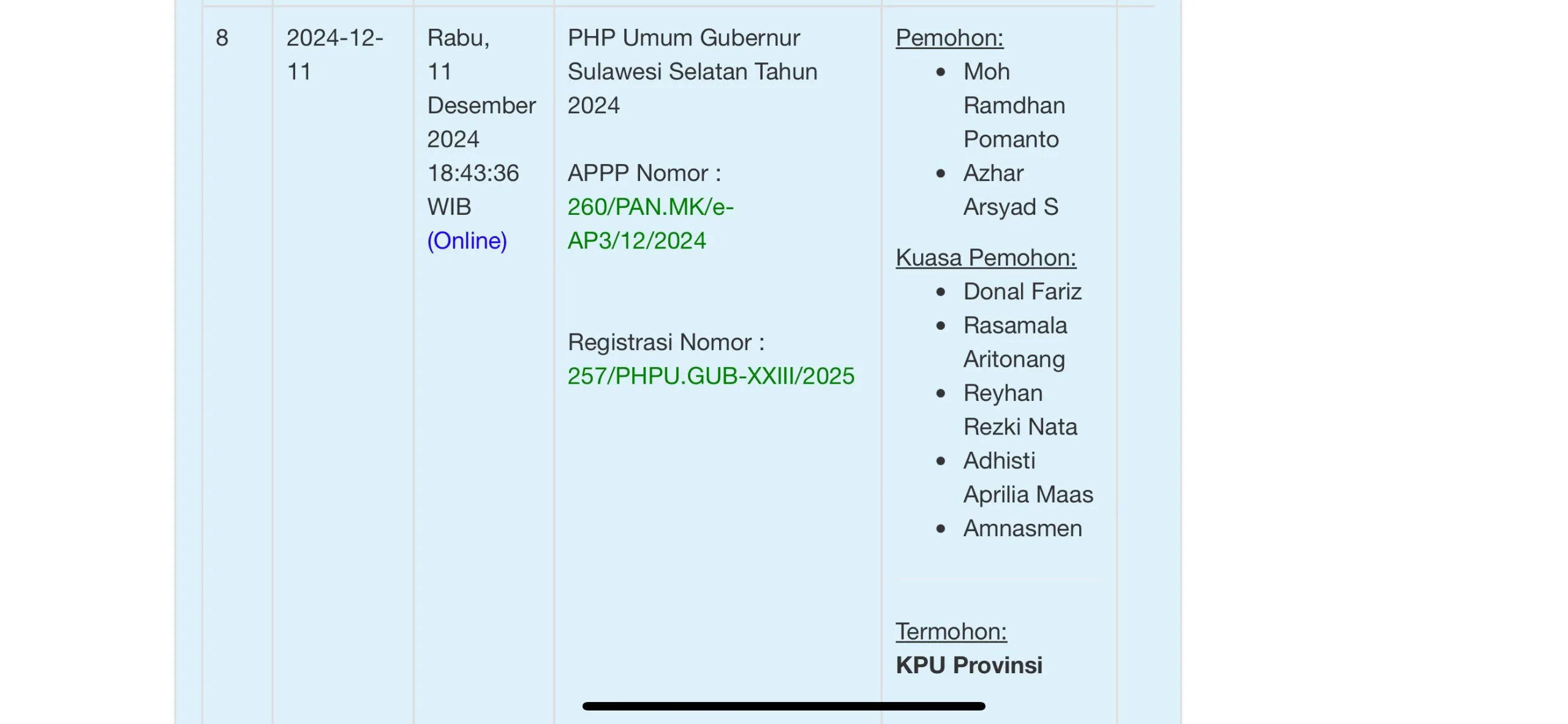 Gugatan tersebut didaftarkan ke dalam Buku Registrasi Perkara Konstitusi Elektronik (e-BRPK) Pilkada dengan menyebut KPU Sulsel selaku termohon.