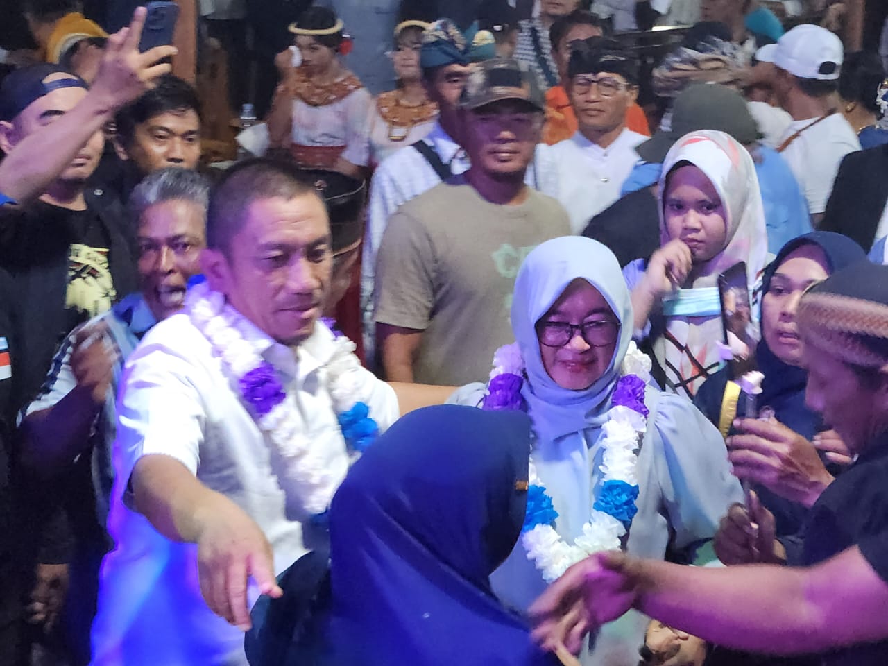 Ibas, sapaan akrab Irwan Bachri Syam, bersama Puspawati Husler disambut dengan tari kemenangan yang dikenal sebagai Pa’gellu’ Pangala, tarian tradisional yang diciptakan oleh Nek Datu Bua’.