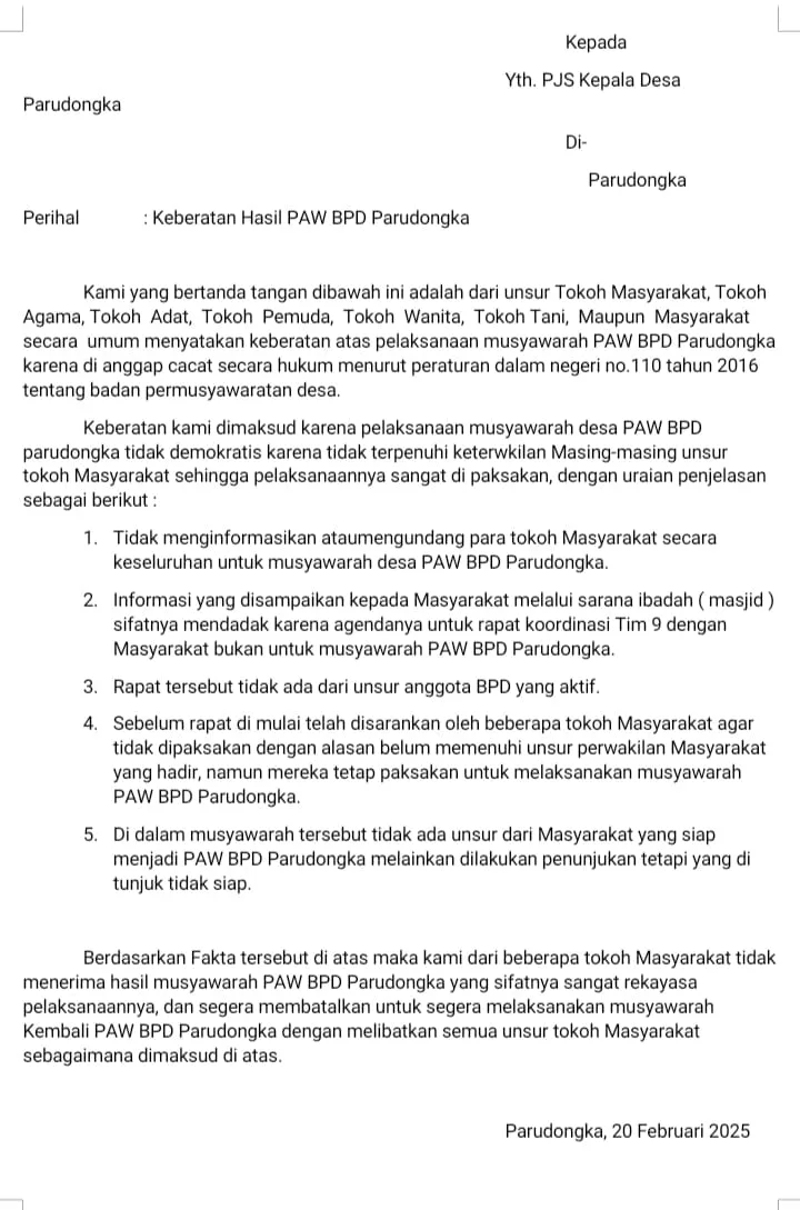Sejumlah tokoh masyarakat telah mengajukan surat keberatan pada 20 Februari 2025 yang ditujukan kepada PJs. Kades Parudongka. Mereka meminta agar penunjukan langsung anggota BPD Parudongka dibatalkan serta dilakukan pemilihan ulang yang lebih terbuka dan transparan.