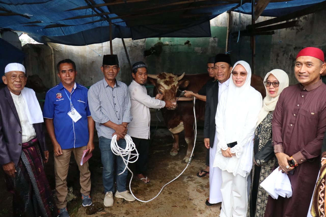 Usai Shalat Ied, Bupati Irwan bersama Wabup Puspawati, Ketua TP PKK Lutim, dan Kapolres Lutim menyerahkan hewan kurban berupa sapi seberat 904 kg dari Presiden RI Prabowo Subianto kepada panitia kurban Masjid Agung Malili.