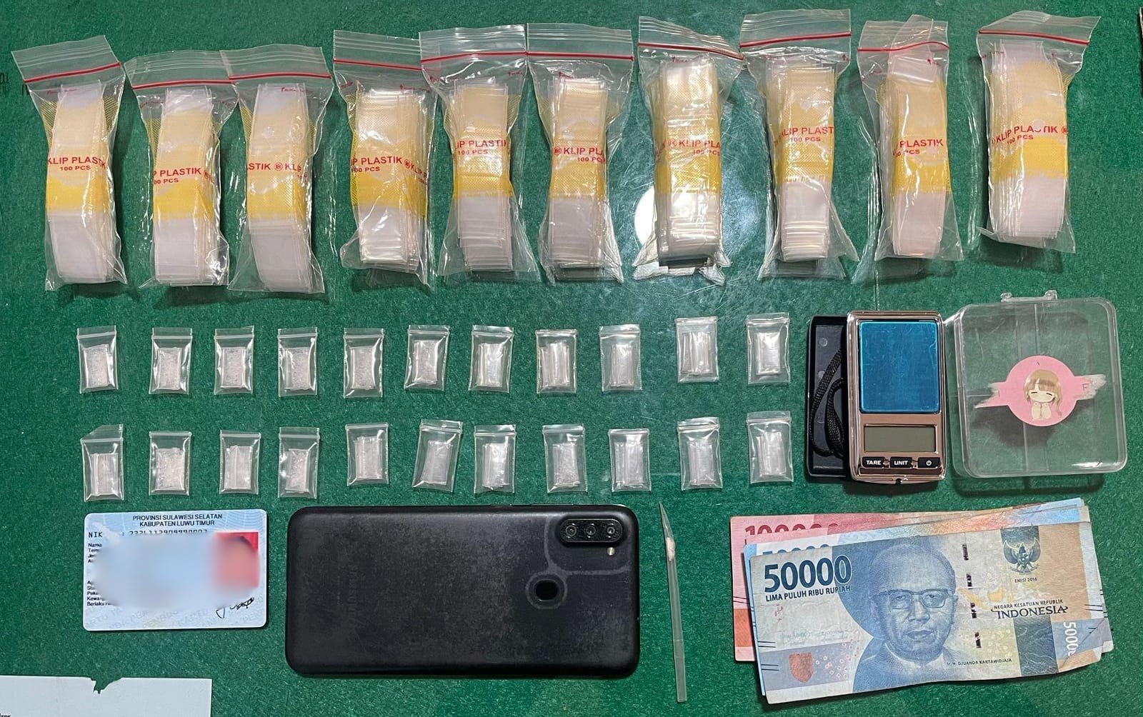 Penangkapan ini dipimpin langsung oleh Kasat Resnarkoba Polres Luwu Timur AKP Nasruddin, didampingi oleh KBO Sat Narkoba IPDA Asmin Mariong, serta sejumlah personel Satuan Narkoba. Berdasarkan hasil penggeledahan di kamar kos milik pelaku, tim berhasil menyita sejumlah barang bukti yaitu: 22 sachet plastik bening kecil diduga berisi sabu seberat 6,16 gram (termasuk pembungkus), 10 ball sachet kosong; 1 buah timbangan digital, 1 pipet plastik yang digunakan sebagai sendok sabu, 1 kotak plastik bening, 1 unit handphone Android merek Samsung warna hitam danUang tunai sebesar Rp. 500.000 (2 lembar pecahan Rp. 100.000 dan 6 lembar pecahan Rp. 50.000).