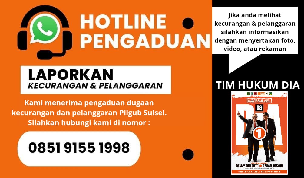 RADARLUWU.COM–MAKASSAR – Tim Hukum Pasangan Calon Gubernur dan Wakil Gubernur Sulsel nomor urut 1, Moh Ramdhan ‘Danny’ Pomanto – Azhar Arsyad (DIA) membuka hotline pengaduan pelanggaran dan kecurangan Pilgub Sulsel.